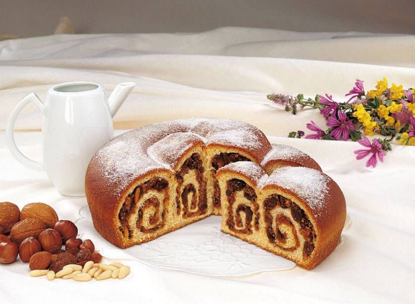 Nestled within, is a symphony of Vogrig Cake ingredients that tells a story. A Gubana Cake crumbly paste significantly rich with finely ground walnuts, plump raisins bursting with natural sweetness, and the delicate crunch of pine nuts in a Cake.